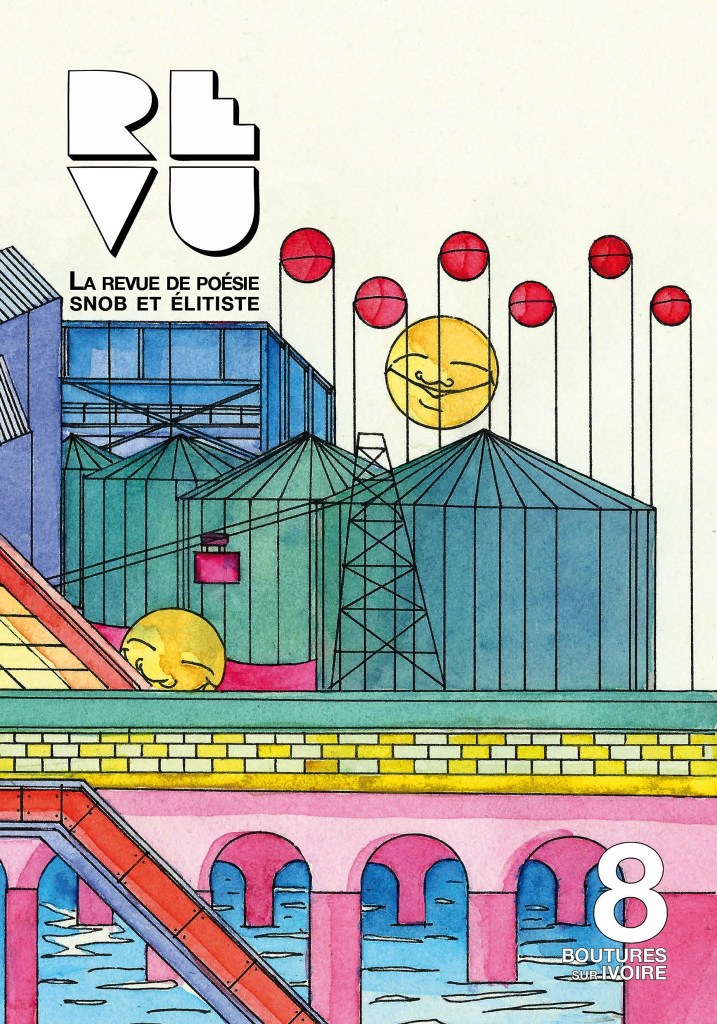 Je participe au numéro 8 de REVU, la Revue de poésie snob et élitiste. Avec une poésie, intitulée Ba Be Bi Bo Bu, qui cherche à monter vers le ciel, avec des vides, et de la folie et des angoisses… Le site web de la revue avec toutes les infos est ici. Et voilà la couverture :