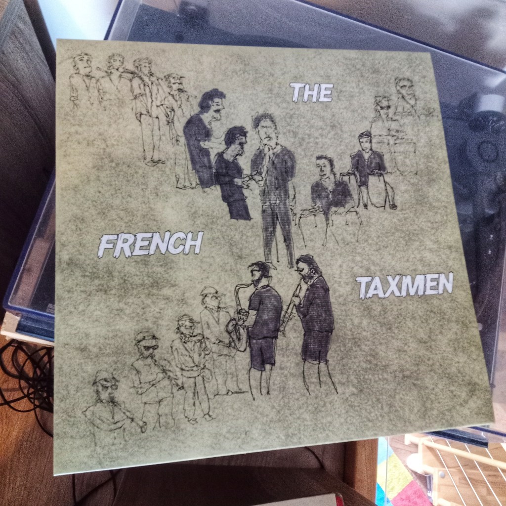 Sketches of the band The French Taxmen, and illustrations of the LP and CD covers.