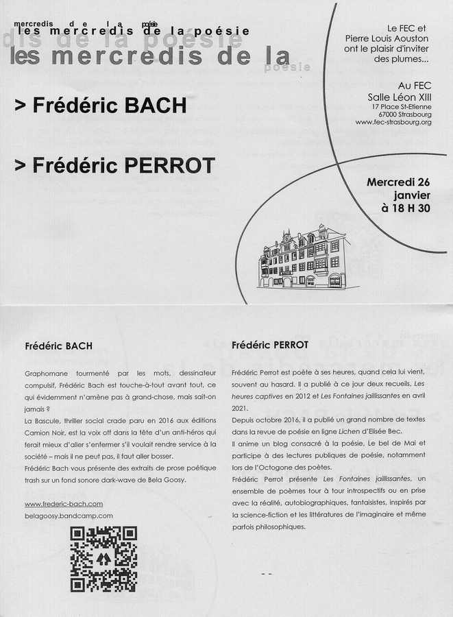 Mon ami Frédéric Perrot lira quant à lui des extraits de son recueil les Fontaines Jaillissantes. Vous trouverez son travail sur le site le Bel de mai.