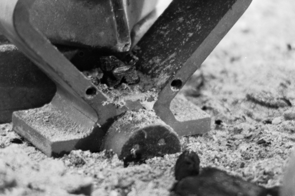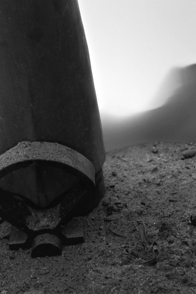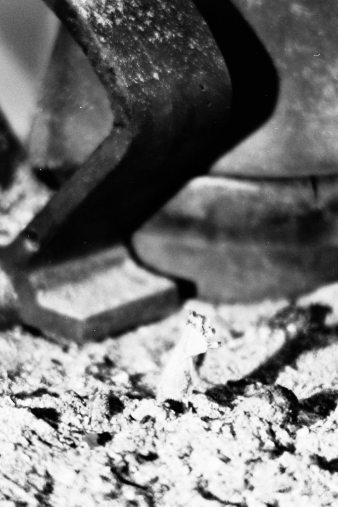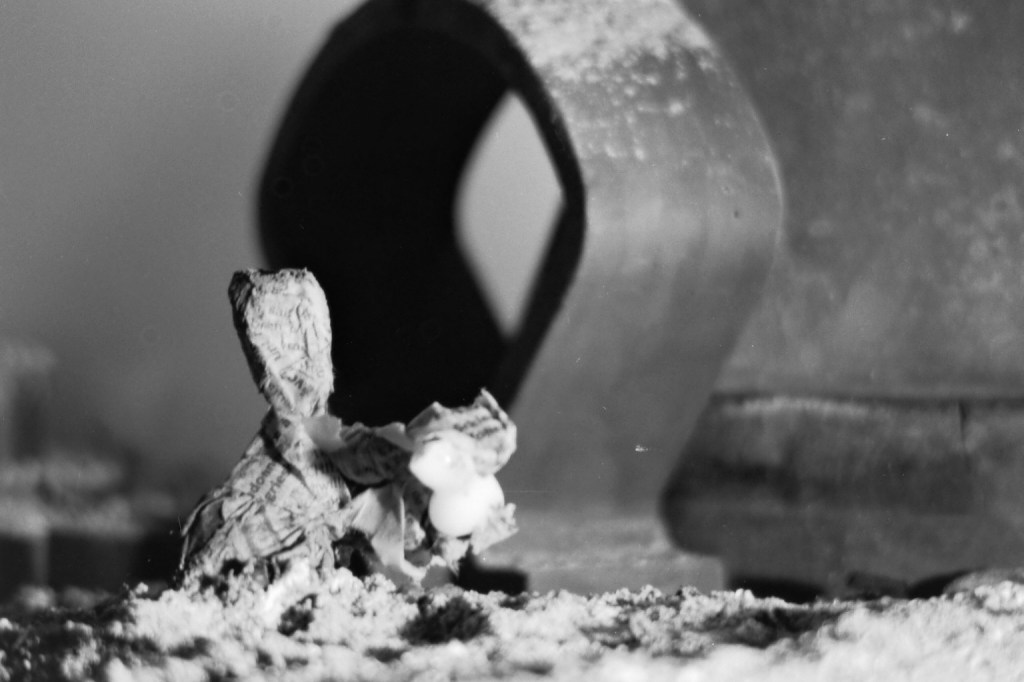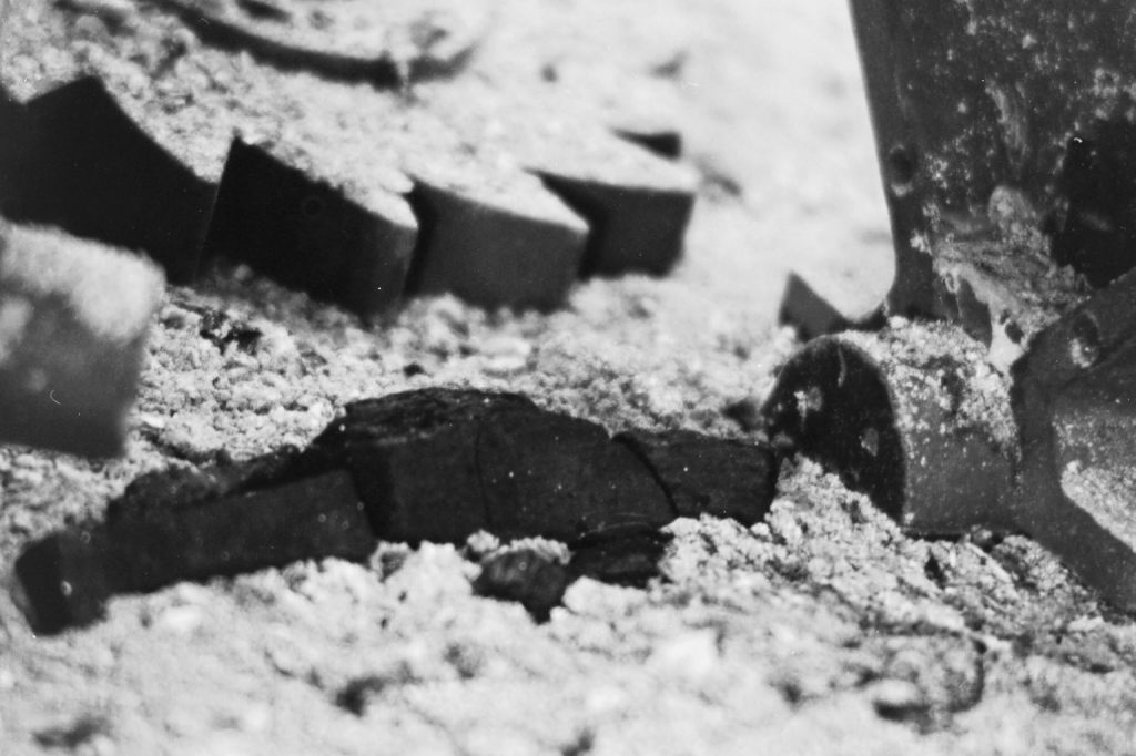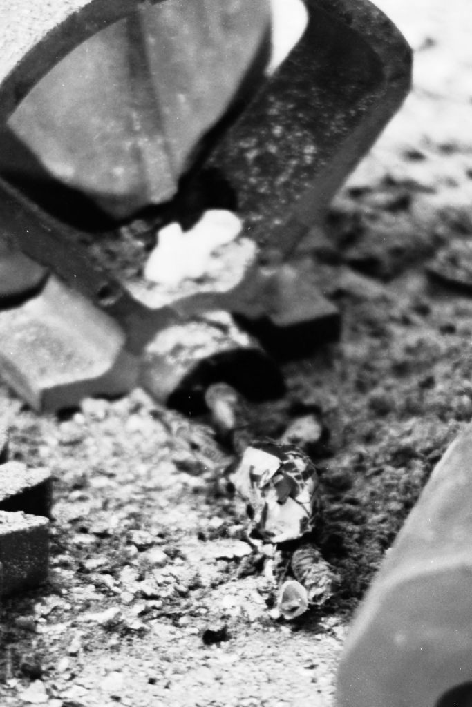 Au milieu des années 90, j’avais transformé ma chambre d’ado en studio-photo pour les prises de vue d’un roman-photo d’anticipation. Après une éruption volcanique, le dernier homme vivant sort de dessous les cendres et se précipite pour adorer un totem des vestiges de sa civilisation. A la fin, il meurt. Côté technique, j’avais un Ricoh KR10M et quelques objectifs, du calque pour le fond, des moules en bois pour figurer les bâtiments, de la cendre et du charbon. Du noir, quoi.