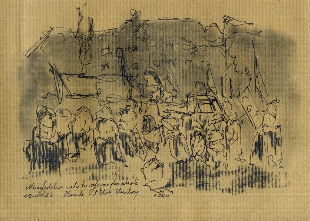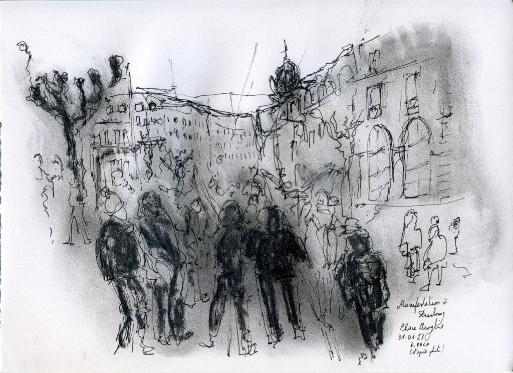 Je participe à ma manière aux manifestations à l’appel de l’intersyndicale contre la réforme des retraites. Le 19 janvier, plusieurs dessins sur le vif sur un bloc de papier kraft, aux stylos et feutres. L’occasion de dessiner en marchant, avec des amis, pour témoigner des luttes que je soutiens, ça bouge, mais c’était assez calme avec la CFDT, j’irai voir les autres groupes dans les prochaines manifestations. Le 31, je n’avais pu me libérer, mais un copain a pris quelques photos de la foule à hauteur d’homme.
