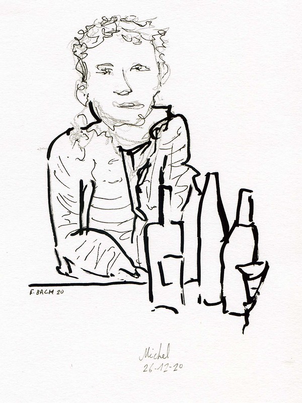 Ce dessin de Michel a été réalisé au bar le Mandala à Strasbourg, lorsqu’un petit groupe d’auteurs, le Mot Ment, se réunissait là-bas une fois par semaine pour partager leurs écrits. Ci-après l’article original sur le blog de Frédéric Perrot, et le poème de Michel, Sans titre.