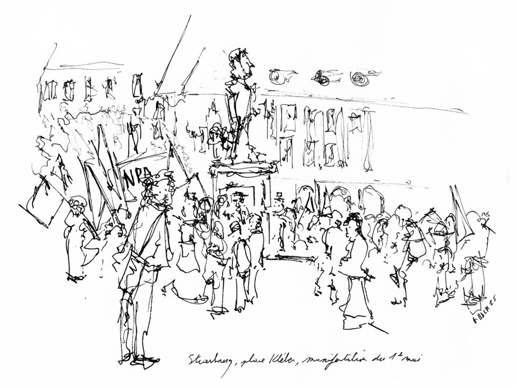 Je me suis calé bien à l’aise sur un banc pour suivre le début de la manifestation de la fête du travail. Mon endroit habituel pour dessiner les bouquinistes de la place Kléber. J’en ai tiré rapidement trois dessins.
