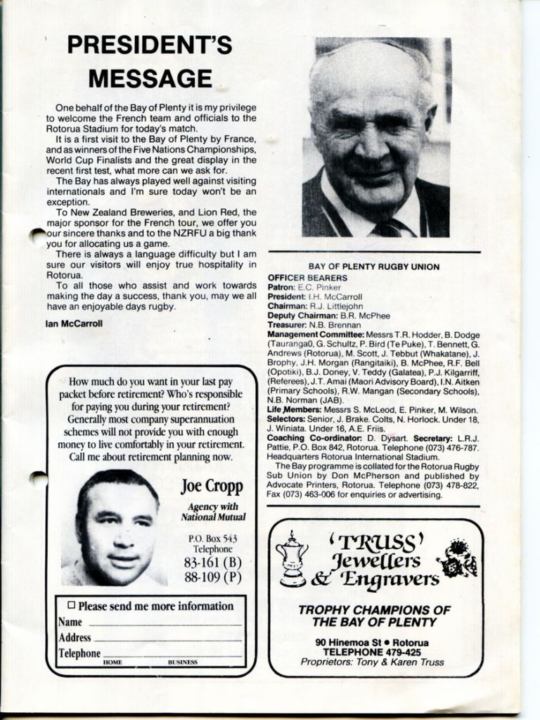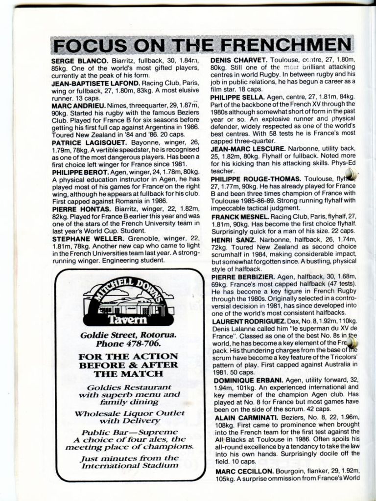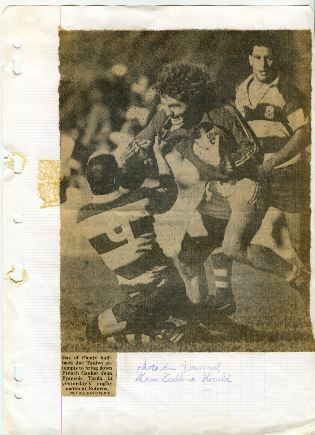 On était arrivé en retard pour le match. Ça aurait été dommage que je rate l’équipe de France en tournée. Le vendeur de billets d’entrée était parti voir le match. Alors on s’est accroupi et on est passé sous les tourniquets d’entrée en marchant en canard. Il y a prescription… Evidemment, on s’est mis au bord du terrain pour mieux suivre le match. La France perdait lorsqu’on est arrivé, au final elle l’emporte 18 – 22. C’est finalement le seul match de rugby que j’ai vu de ma vie – mais on y jouait avec les copains de l’école, tous les jours avant les cours et pendant la pause de midi, après avoir avalé rapidement une chicken pie ou un sandwich tiré de la lunch box.